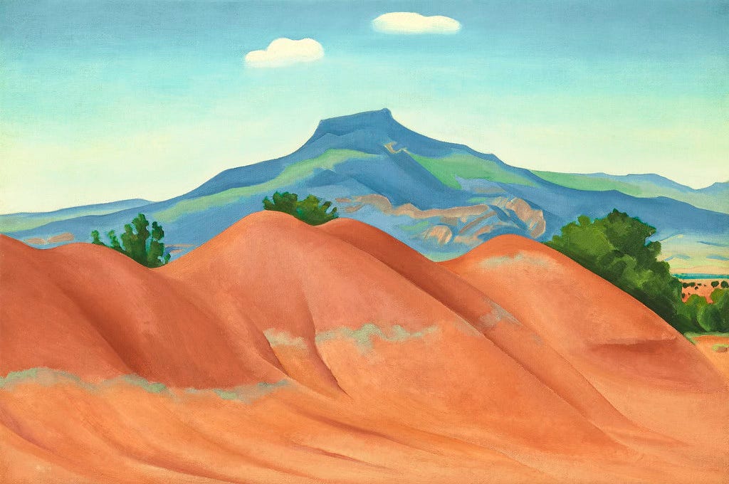 For example, in “Red Hills with Pedernal,” she portrays her favorite nearby mountain but in isolation from the wider landscape and juxtaposed with a mound of red hills most observers would look past to see the mountain.