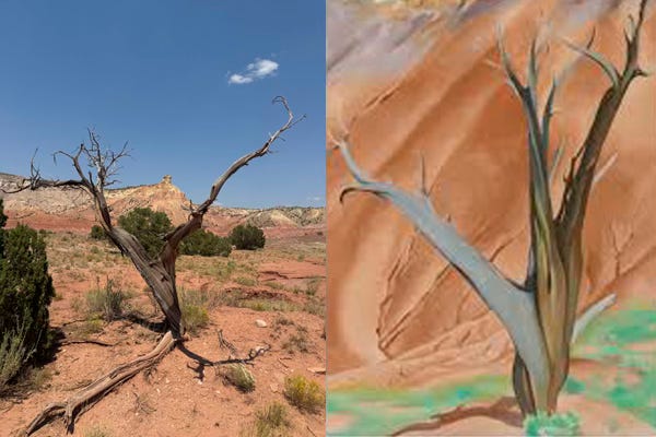 For example, in 1937 O’Keeffe painted “Gerald’s Tree,” a simple representation of a petrified tree trunk and branches. We stood right in front of that same tree, and you can judge for yourself by the photos whether anything has changed.