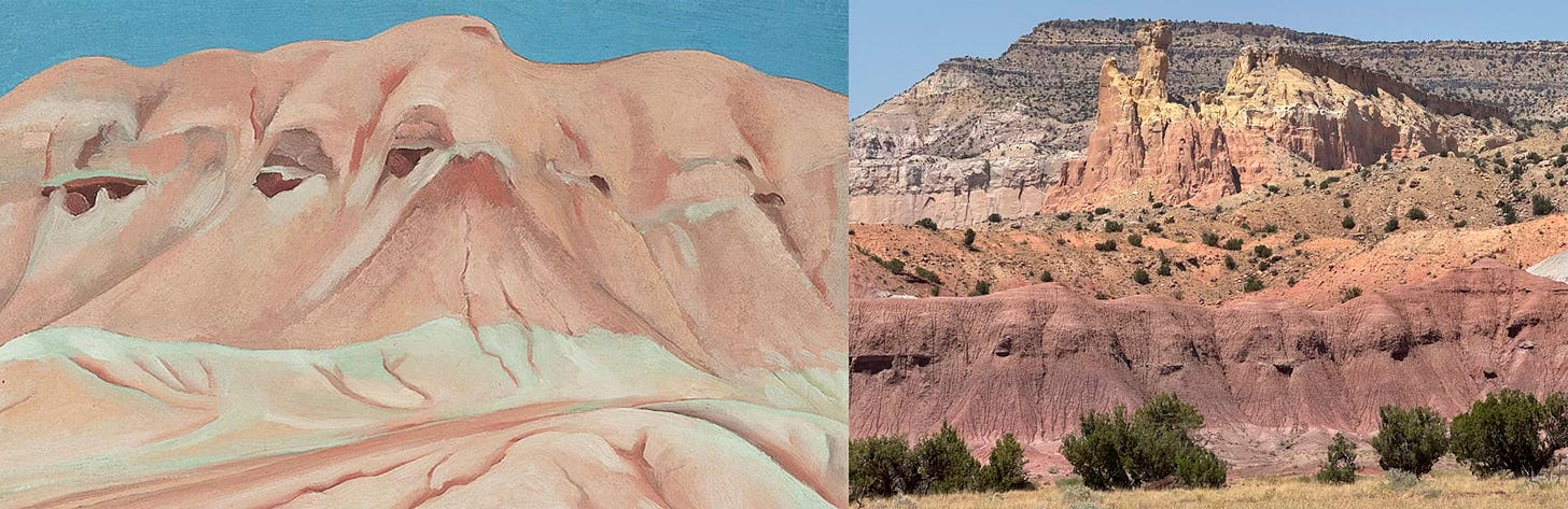 Remember that when O’Keeffe started painting in the early 20th century, people were accustomed to landscape paintings showing sweeping vistas, minute detail and panoramas as wide as the eye could see. Into that world, she brought a zoom lens with her paint brush. Most of her landscapes focus on small details, isolated and magnified to fill the panel.